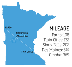 Alexandria is between Minneapolis, MN and Fargo, ND on Interstate 94.